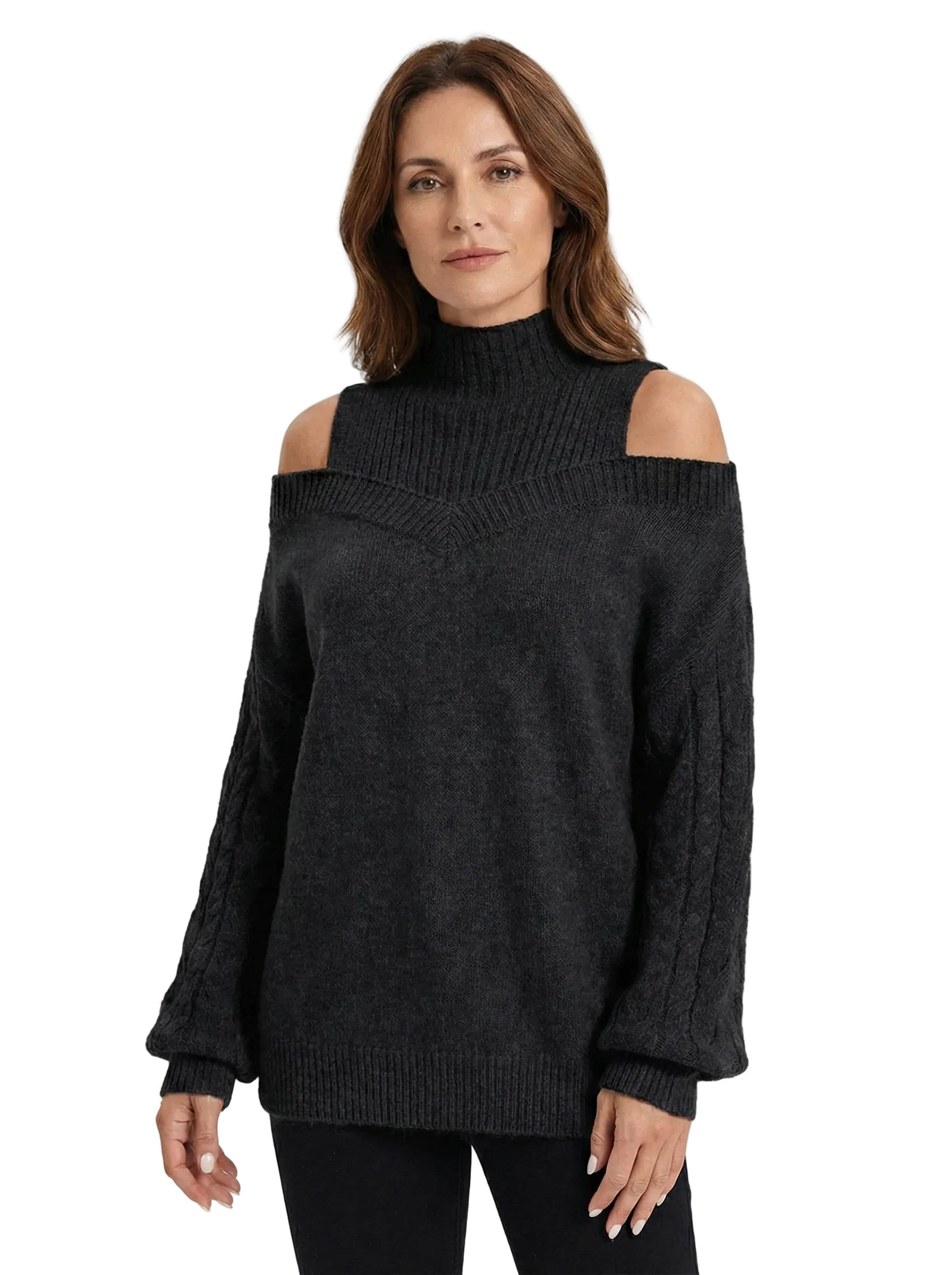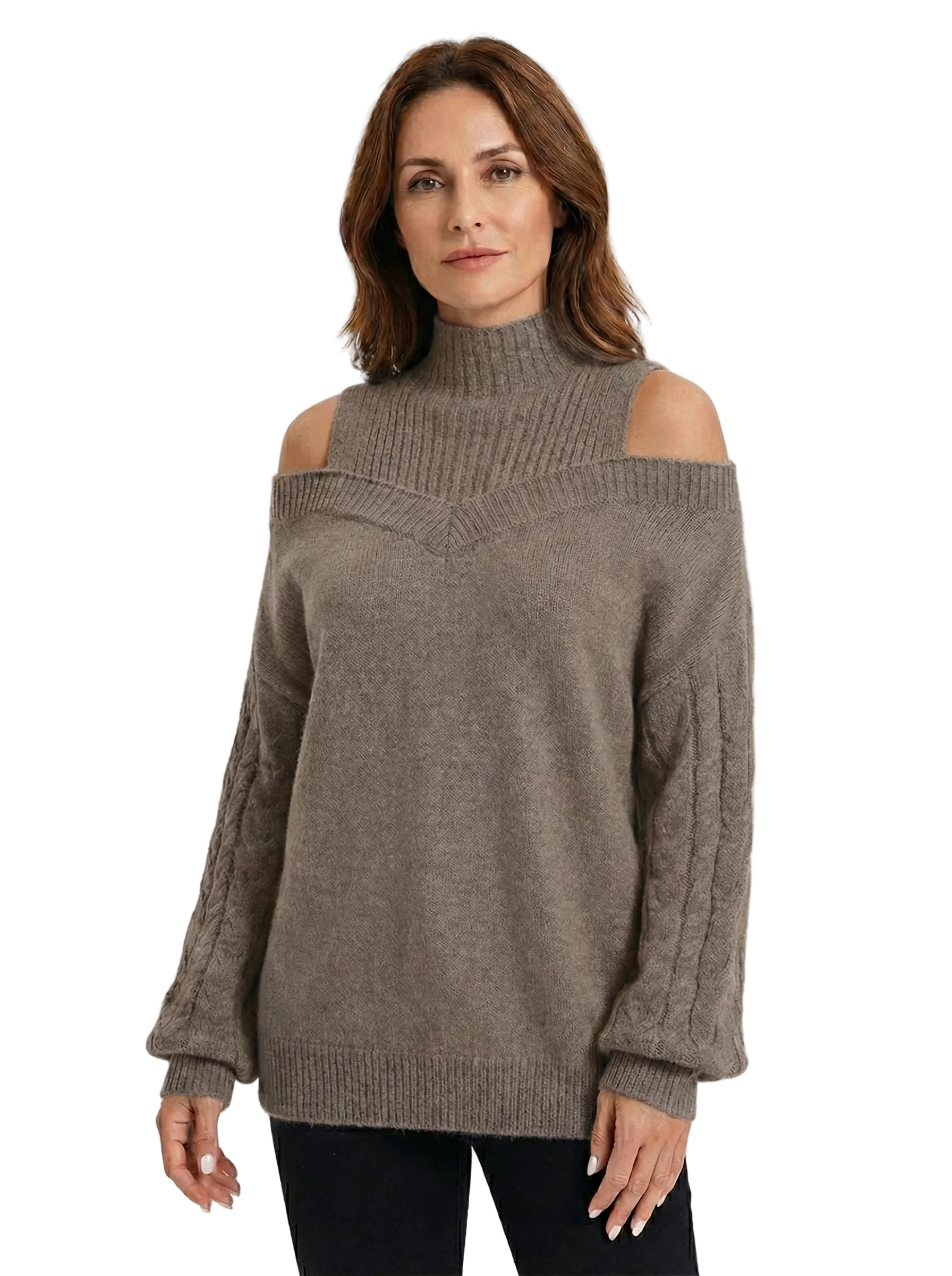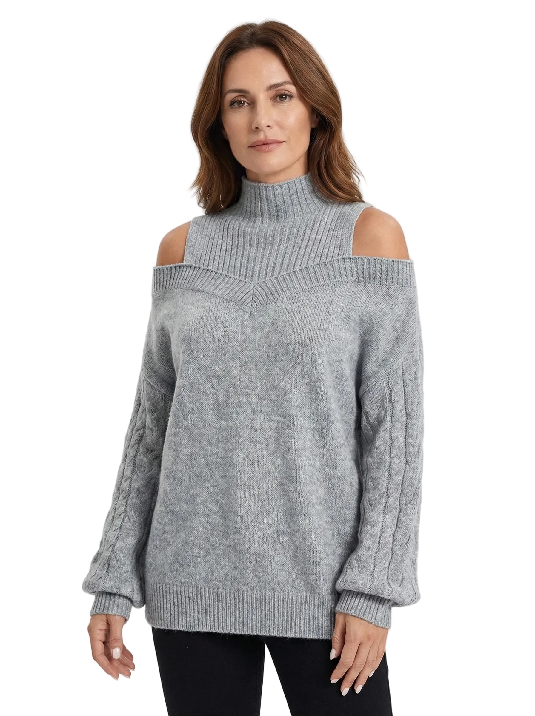 "Ce modèle gris est d'une douceur incroyable. J'adore le détail des épaules dénudées, c'est très chic pour l'hiver."